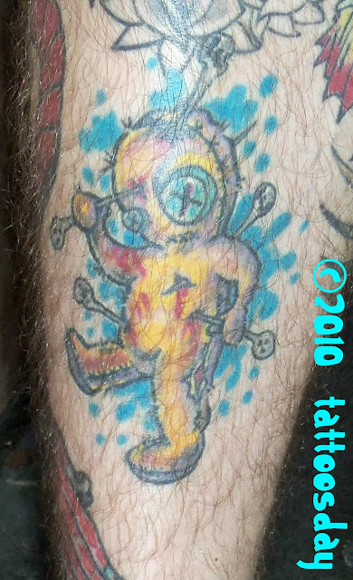 His right leg is devoted more to "Black Magic," hence the baby voodoo doll on the front of his shin.